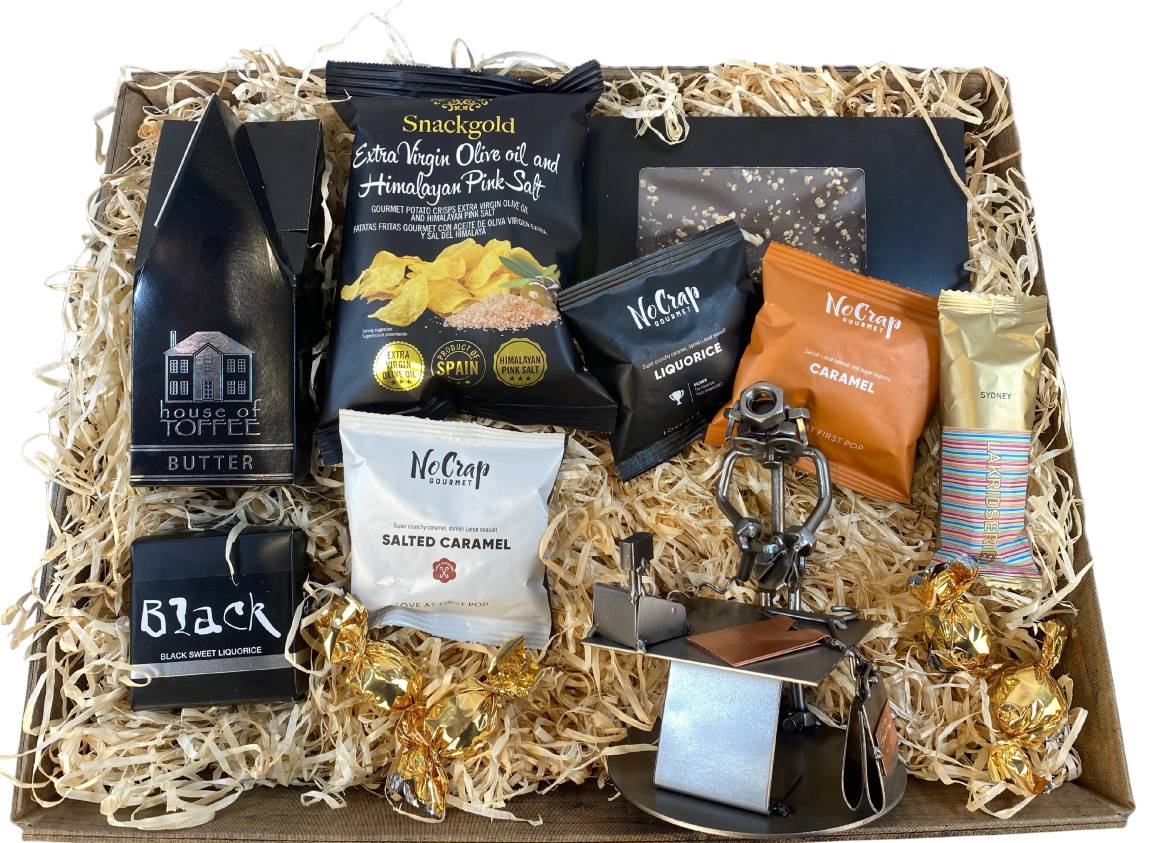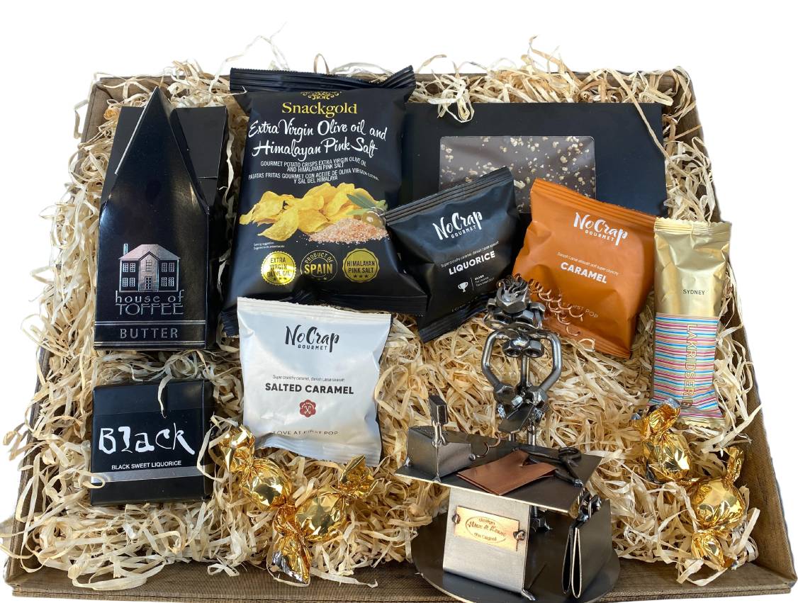 • Gavekurv Med Metalfigur - Butiksassistent - Salgsassistent - Mand - Lækkerier - Design & Handelshuset